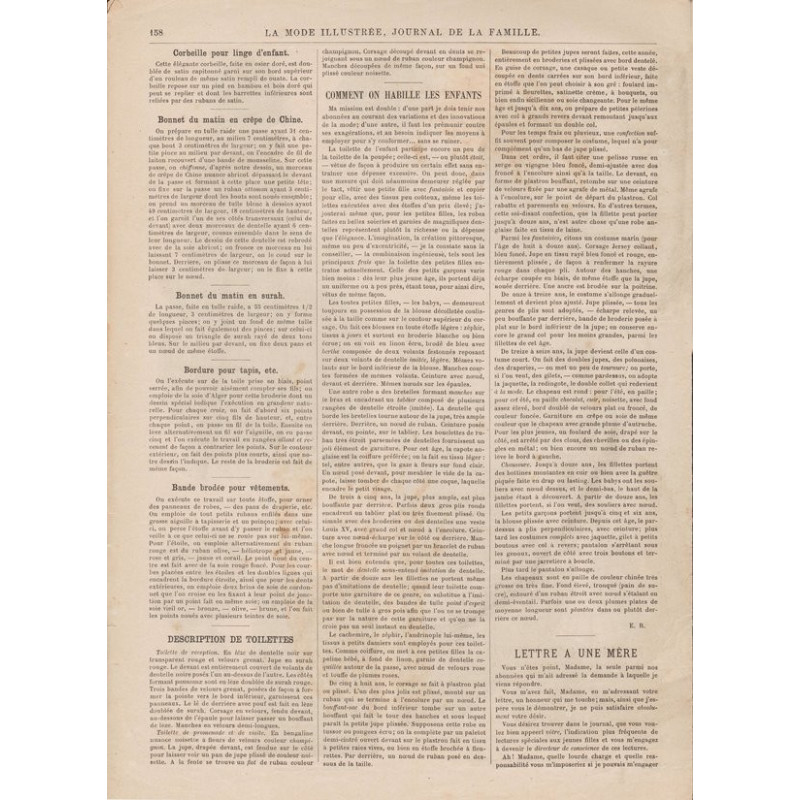 Chaque magazine présentait des modèles de robes , de lingerie , de corsets , mais aussi des vêtements d’enfants ou habits de poupées , avec de magnifiques gravures et les explications des modèles .