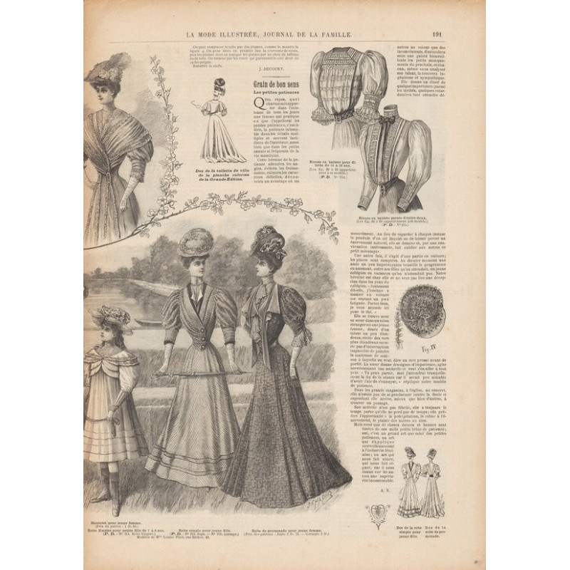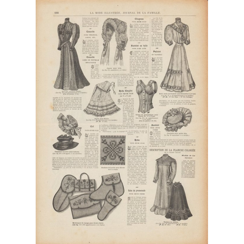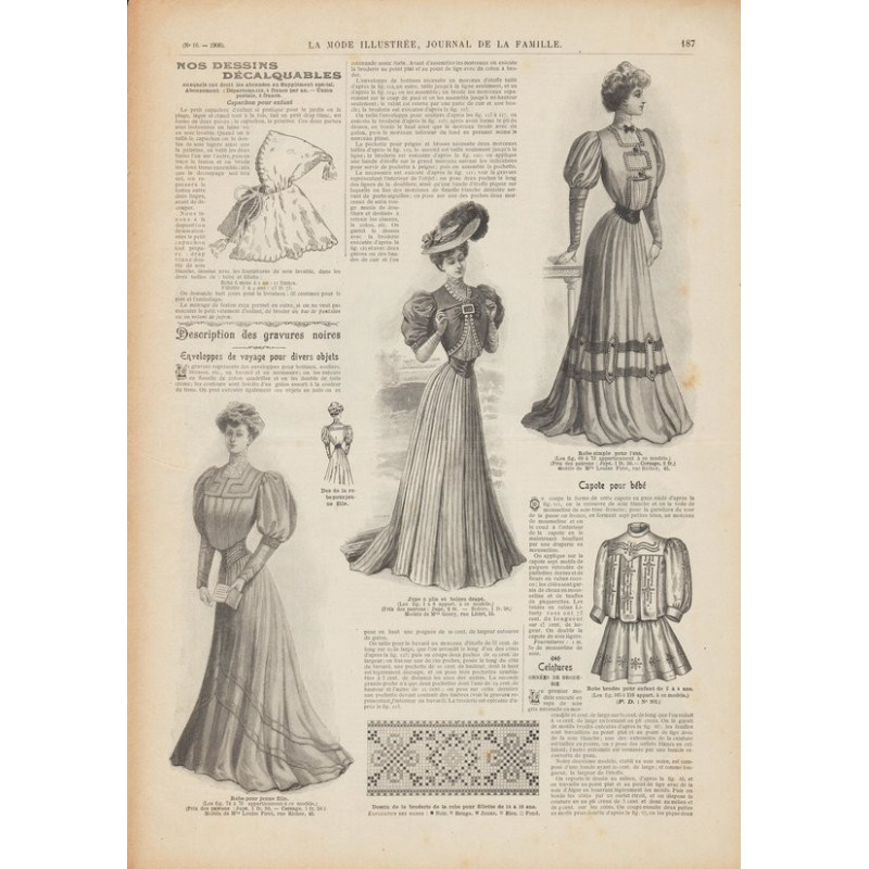 Chaque magazine présentait des modèles de robes , de lingerie , de corsets , mais aussi des vêtements d’enfants ou habits de poupées , avec de magnifiques gravures et les explications des modèles .