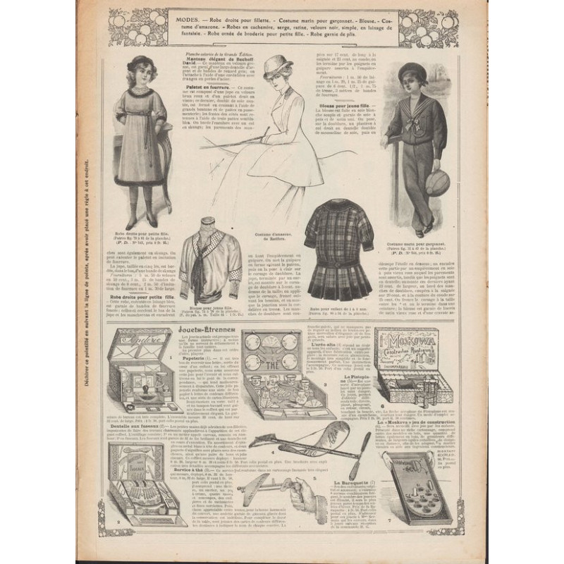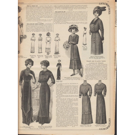 Chaque magazine présentait des modèles de robes , de lingerie , de corsets , mais aussi des vêtements d’enfants ou habits de poupées , avec de magnifiques gravures et les explications des modèles .