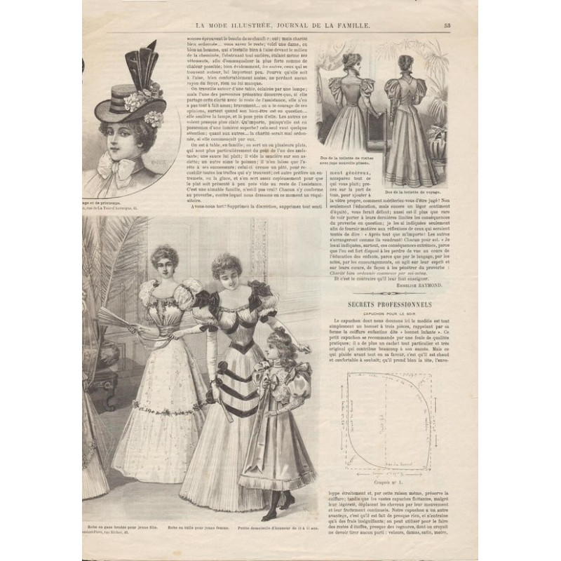 Chaque magazine présentait des modèles de robes , de lingerie , de corsets , mais aussi des vêtements d’enfants ou habits de poupées , avec de magnifiques gravures et les explications des modèles .